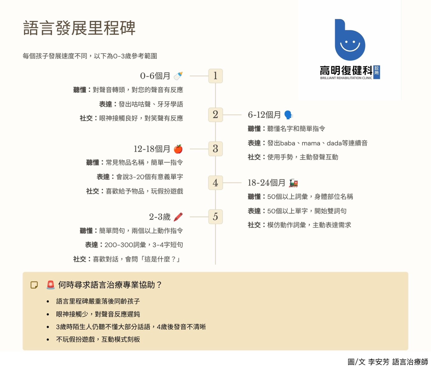 異常警訊: 不會說雙詞句;語言表達單字量少於20個;大部分時候都用拉人或尖叫代替說話。