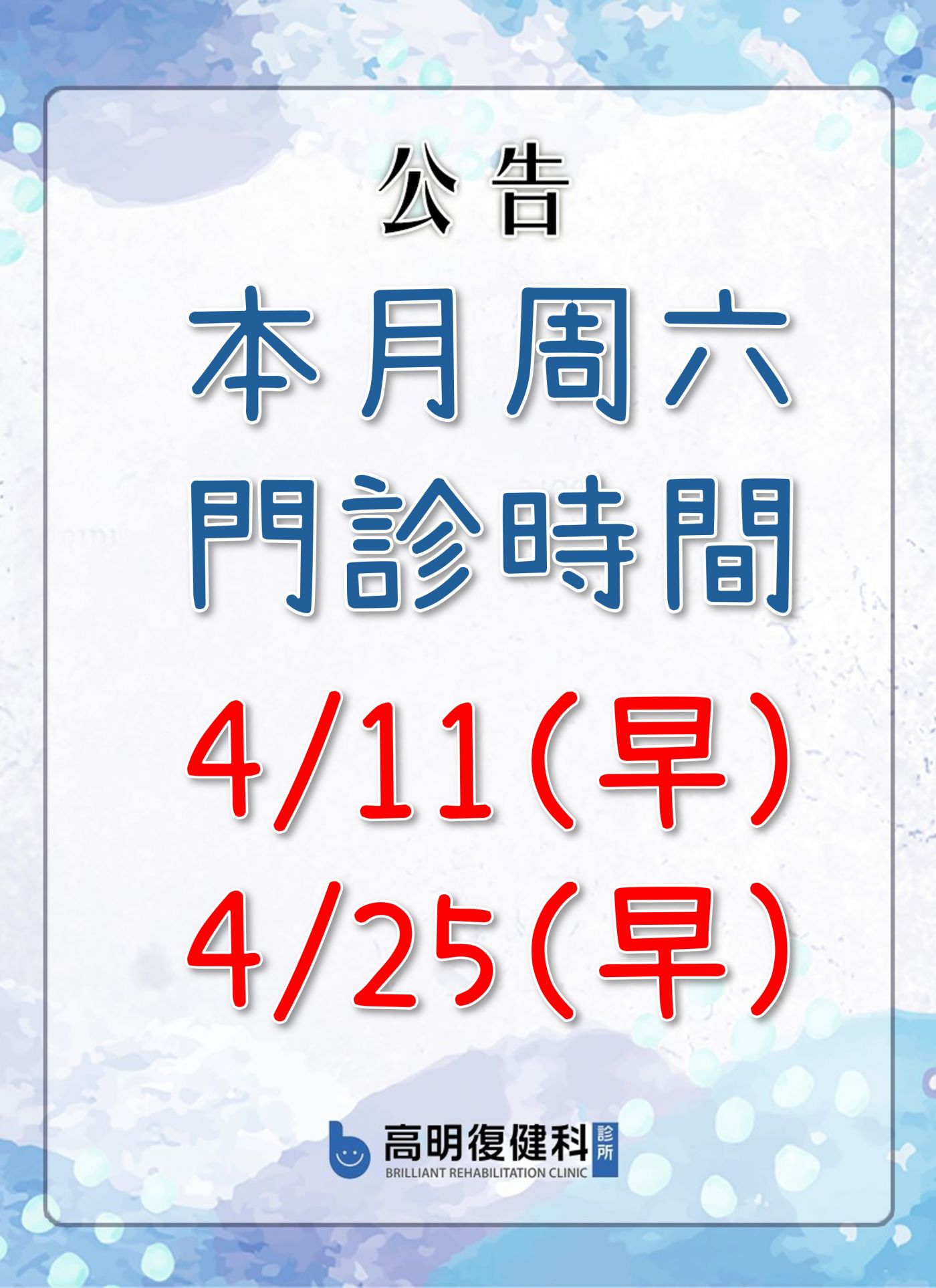 【4月周六門診時間公告】
