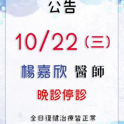 【10月門診異動公告】 10/22(三) 楊嘉欣醫師 晚診停診 - 復健治療皆正常, 造成不便,敬請見諒。