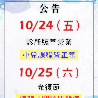 【光復節】 10/24(五) 診所照常營業,小兒課程皆正常。 - 10/25(六) 復健/門診皆暫停 造成不便,敬請見諒。