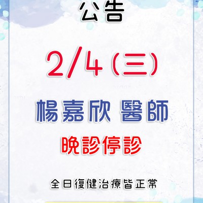 【2月門診異動公告】 2/4(三) 楊嘉欣醫師 晚診停診 - 復健治療皆正常, 造成不便,敬請見諒。