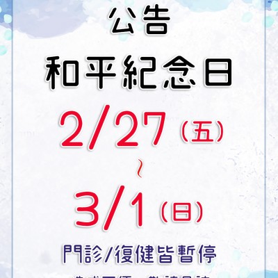 【和平紀念日連假公告】 2/27(五)~3/1(日) 復健/門診皆暫停 造成不便,敬請見諒。